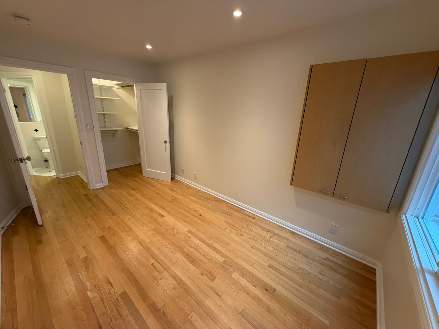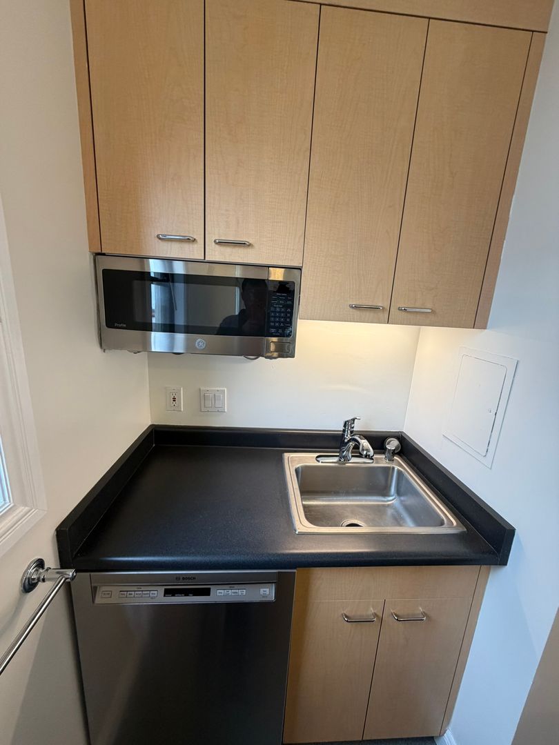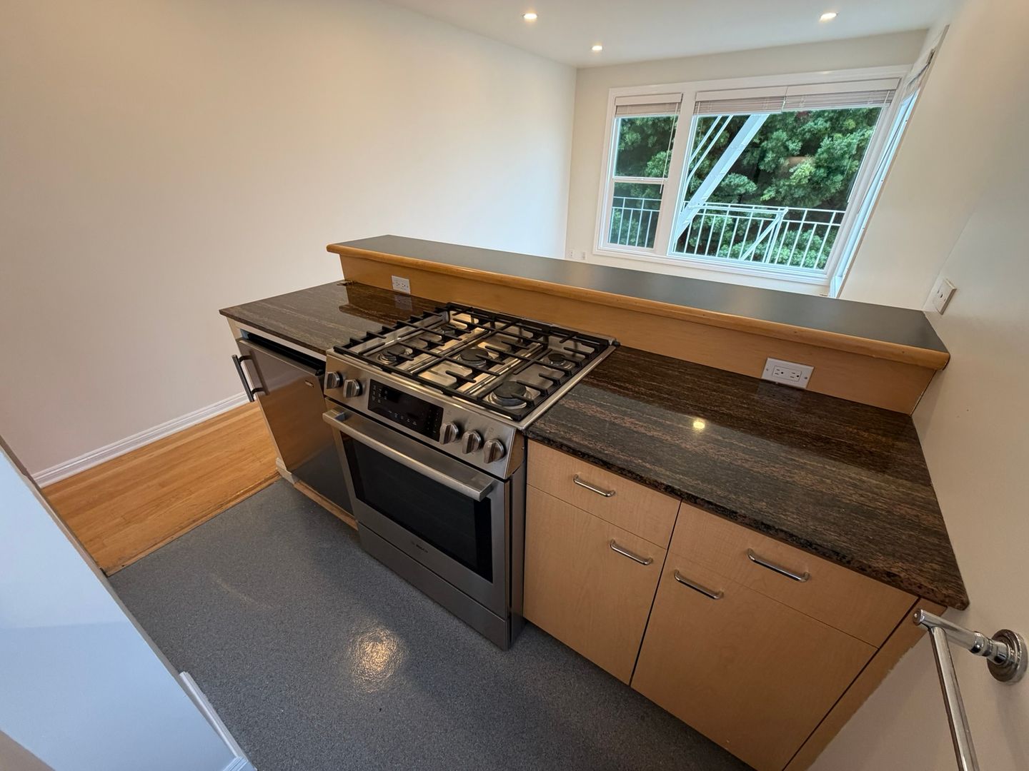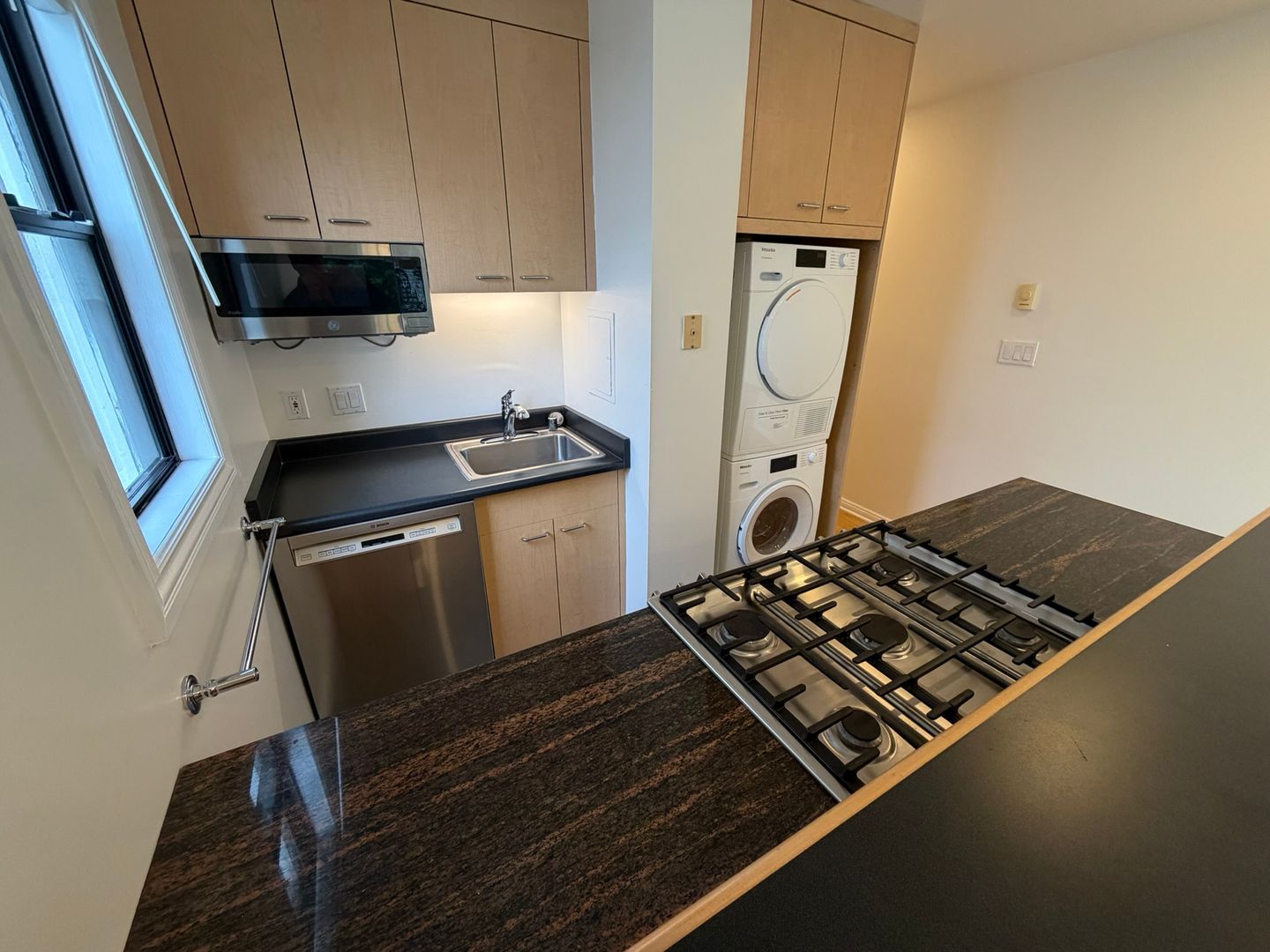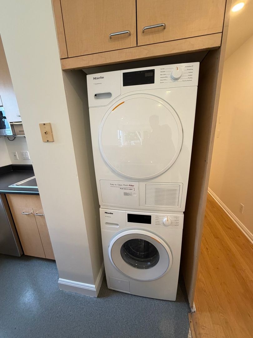 The kitchen of the unit includes maple laminate cabinets, granite counters and near new appliances. There is a high quality gas range, built in microwave, dishwasher, disposal, fridge and freezer. Most importantly, it has a brand new in-unit laundry!