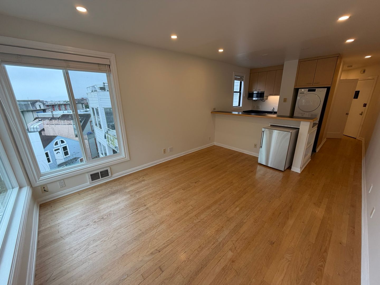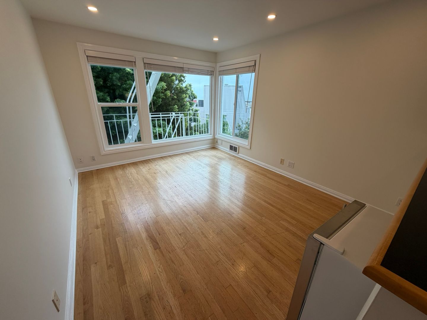 The unit is on the third floor on the north side of the building, which means it is away from the street and very quiet. It has a very nice partial view towards the east bay. It has been completely remodeled. It has all new double paned windows with screens and real wood blinds.
