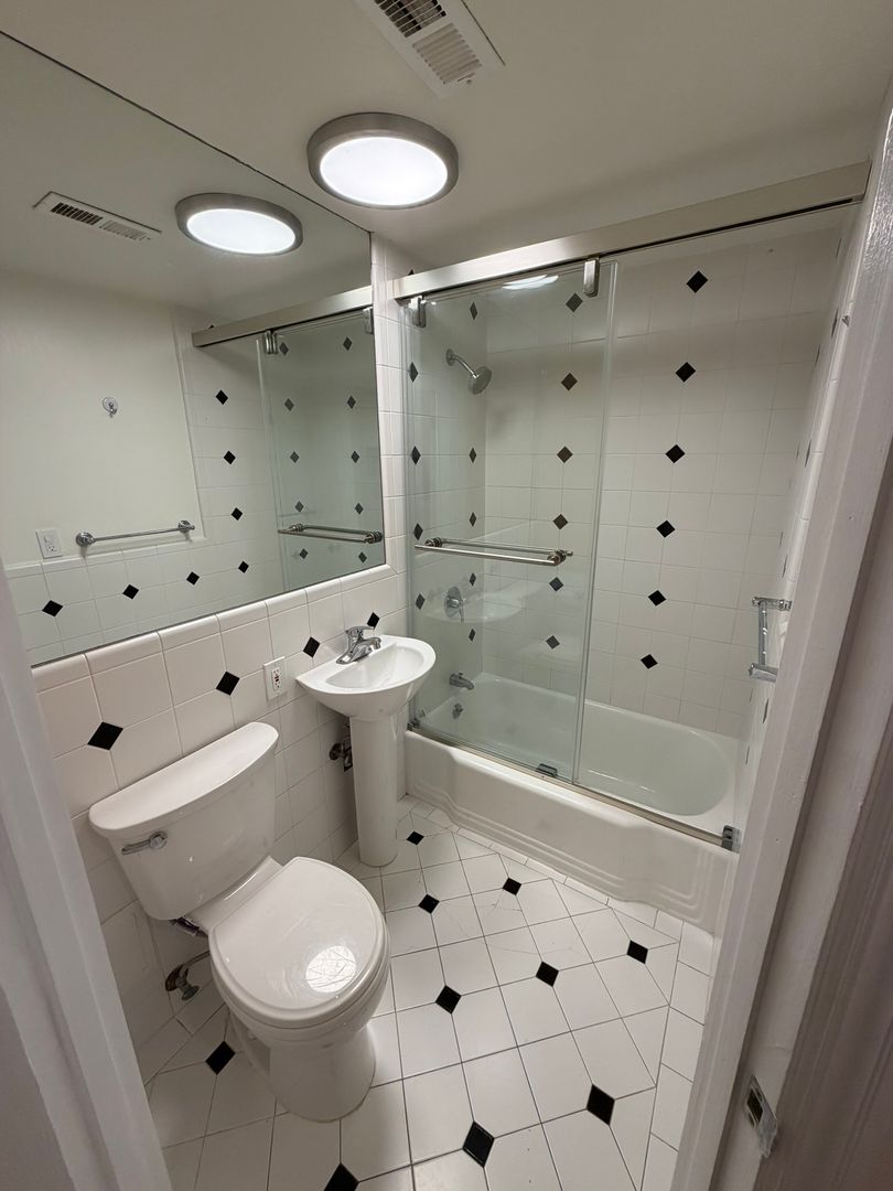 The bathroom has a very nice checkerboard design of white and black tile. The plumbing in the building is all rebuilt, including copper pipes, new waste lines, etc. The hot water is instant because there is a re-circulating system with an electric pump which keeps the hot water flowing through insulated pipes. The faucets and shower valves are modern and almost new. There is a large mirror and large medicine cabinet. The bathroom is ventilated by an automatic re-circulating fan system on the roof to help keep the bathroom fresh and mildew free.